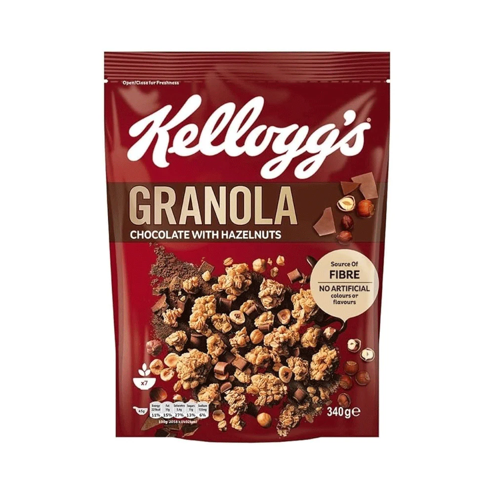 Kellogg’s Granola Chocolate with Hazelnut 340g combines crunchy oat clusters with rich chocolate and hazelnut pieces for a deliciously indulgent yet nutritious breakfast or snack.
